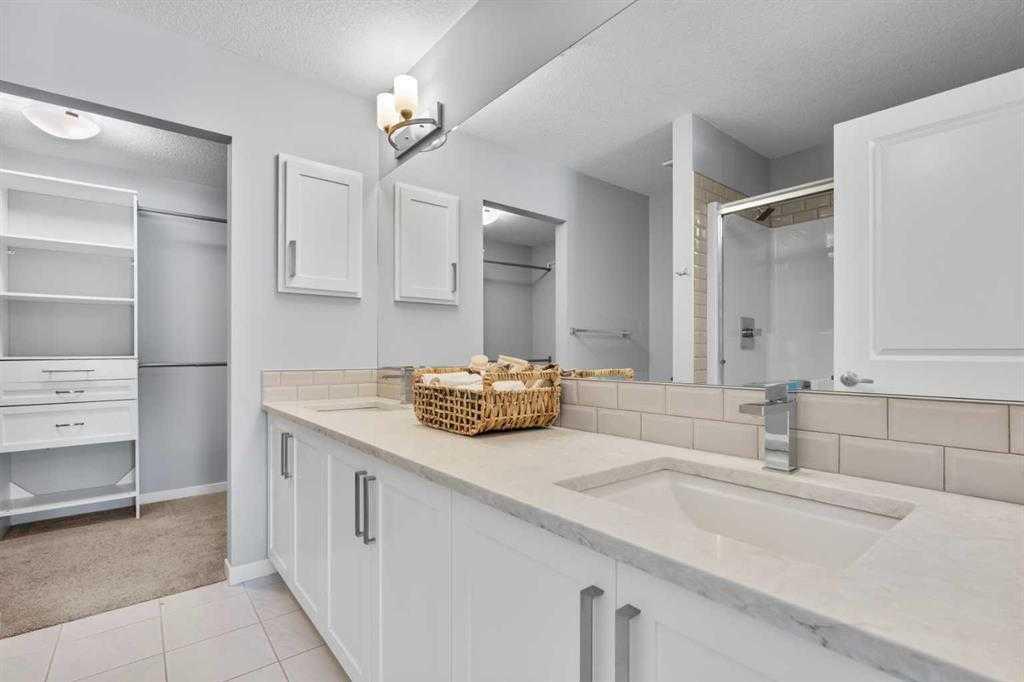 The primary bedroom is oversized — comfortably fitting a king bed, side tables, and still leaving room to breathe. It feels like a true retreat, not an afterthought. The ensuite elevates the experience with double vanities, ample storage, and a walk-in closet that actually works for real life.
