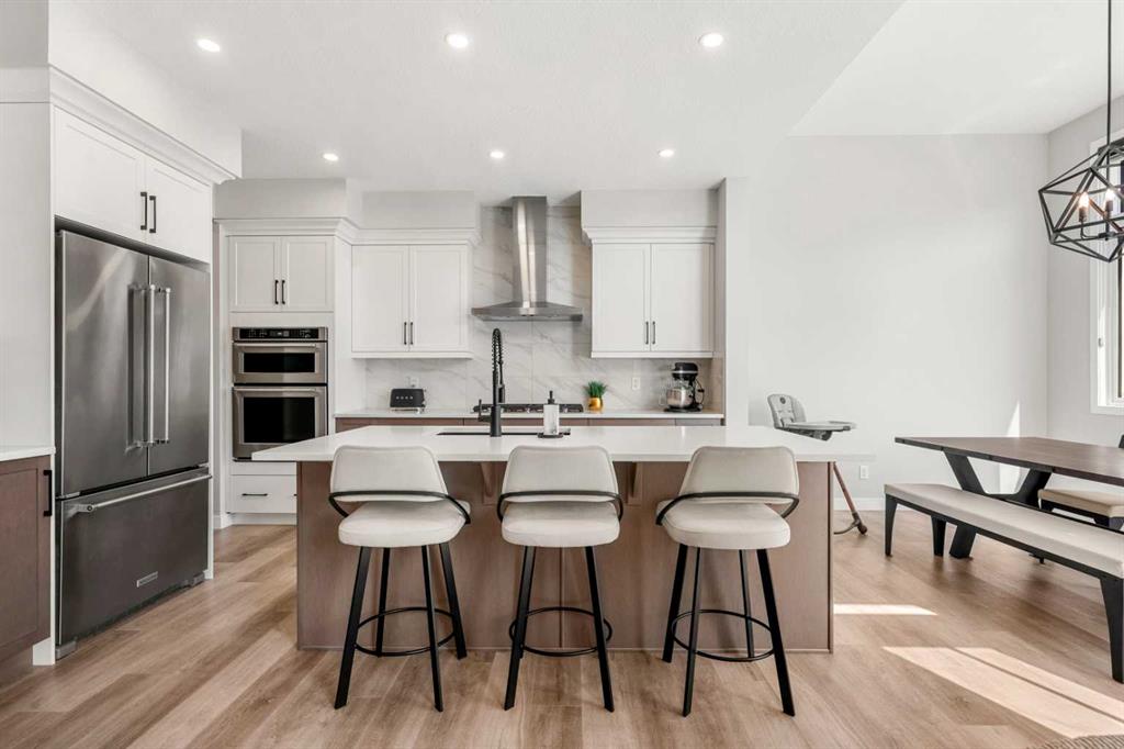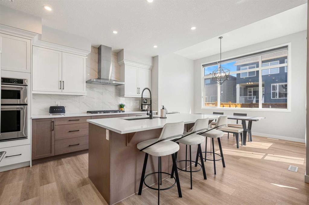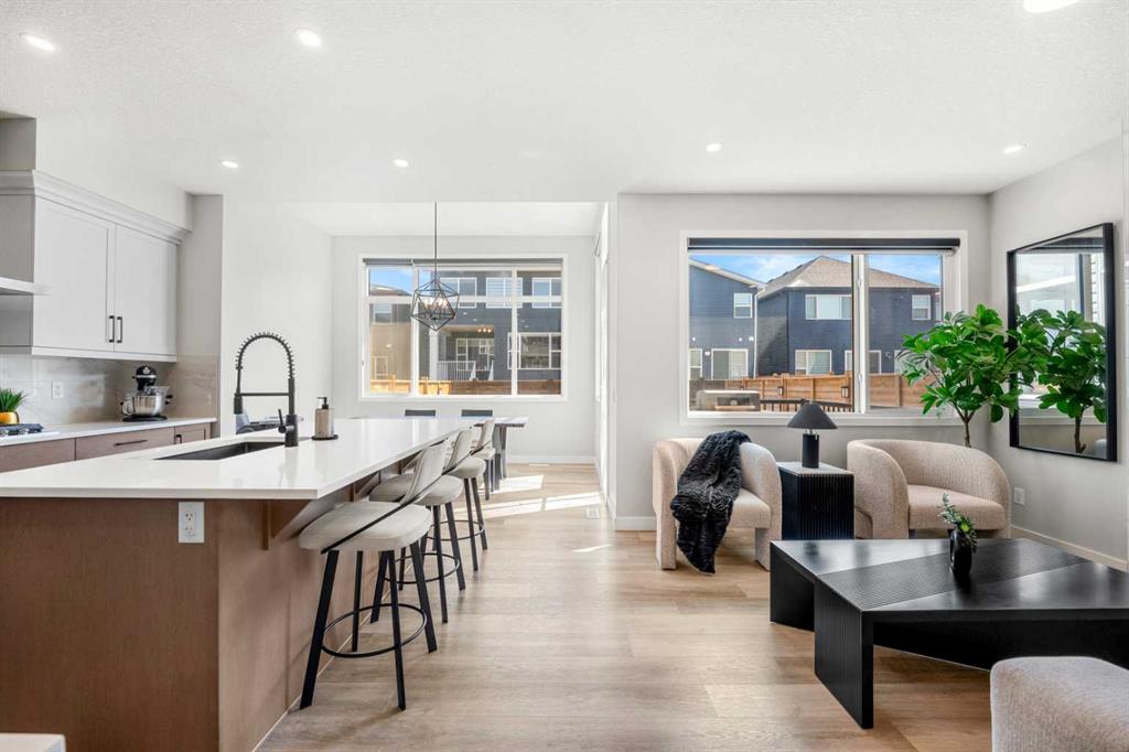 From the moment you step inside, you’ll appreciate the bright, modern design, open-concept layout, and abundance of natural light that fills the home. The main floor is both stylish and functional, featuring a spacious living area and a contemporary kitchen complete with sleek finishes, ample cabinetry, and a large island that’s ideal for meal prep and casual dining. The adjacent dining space is framed by oversized windows and highlighted by soaring ceilings, creating an inviting setting for both everyday living and entertaining.