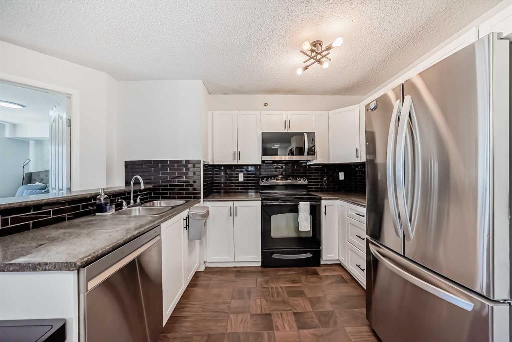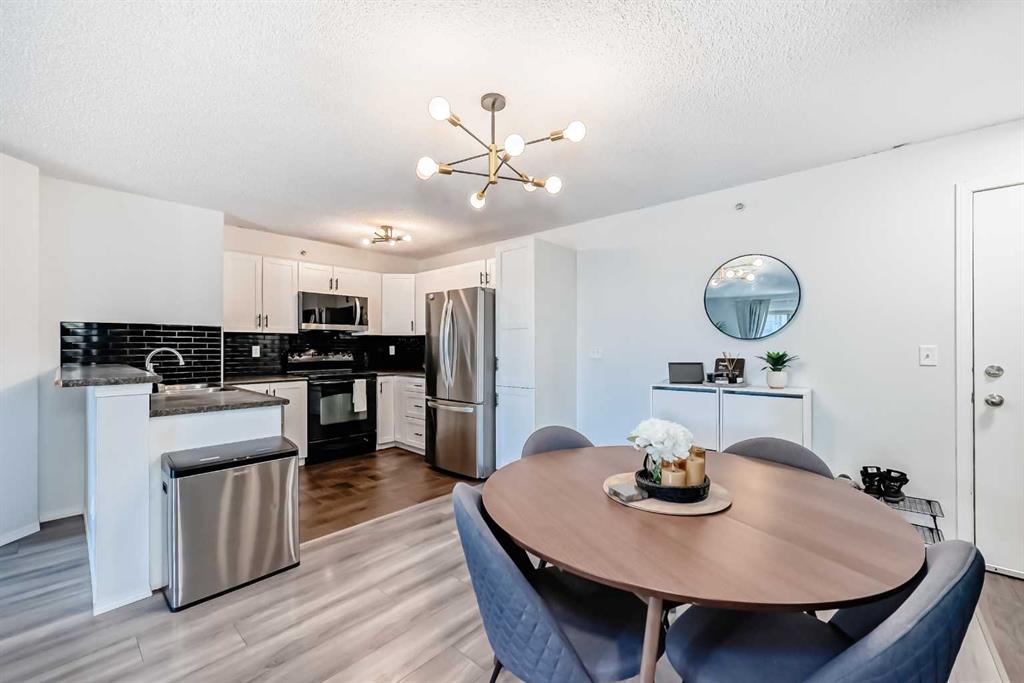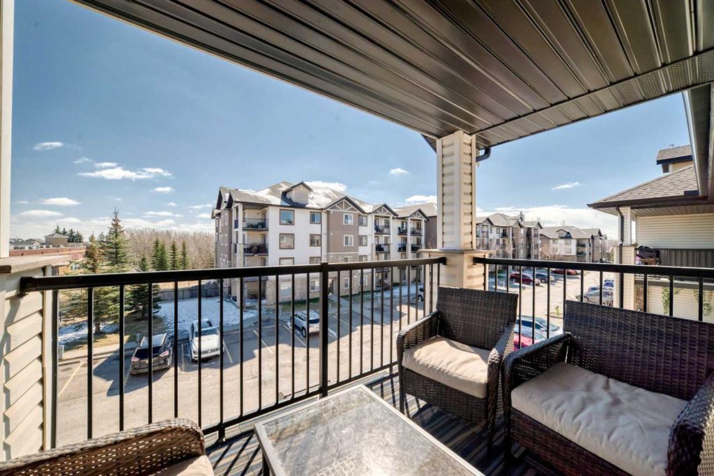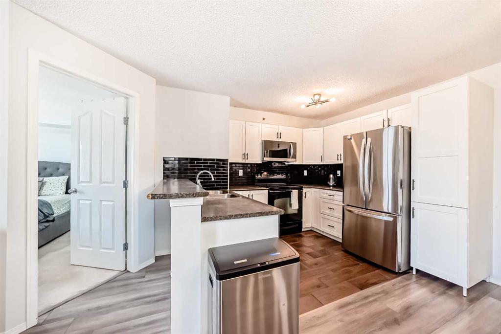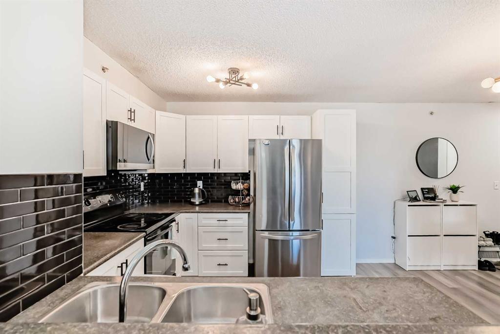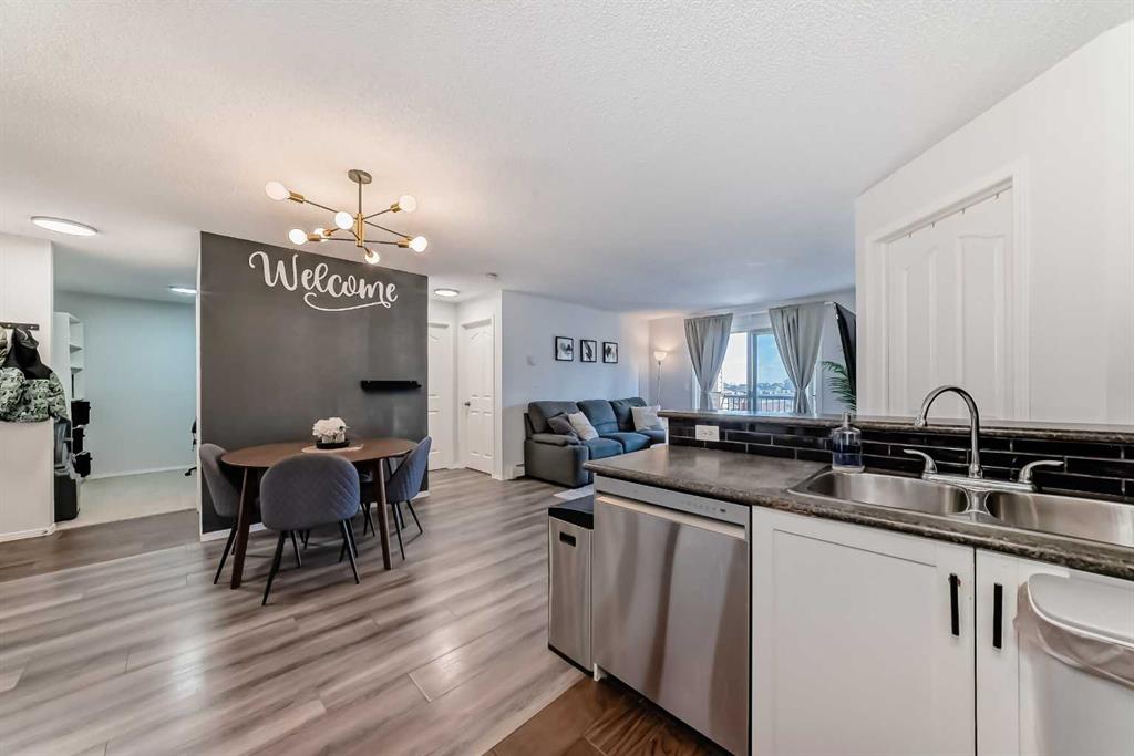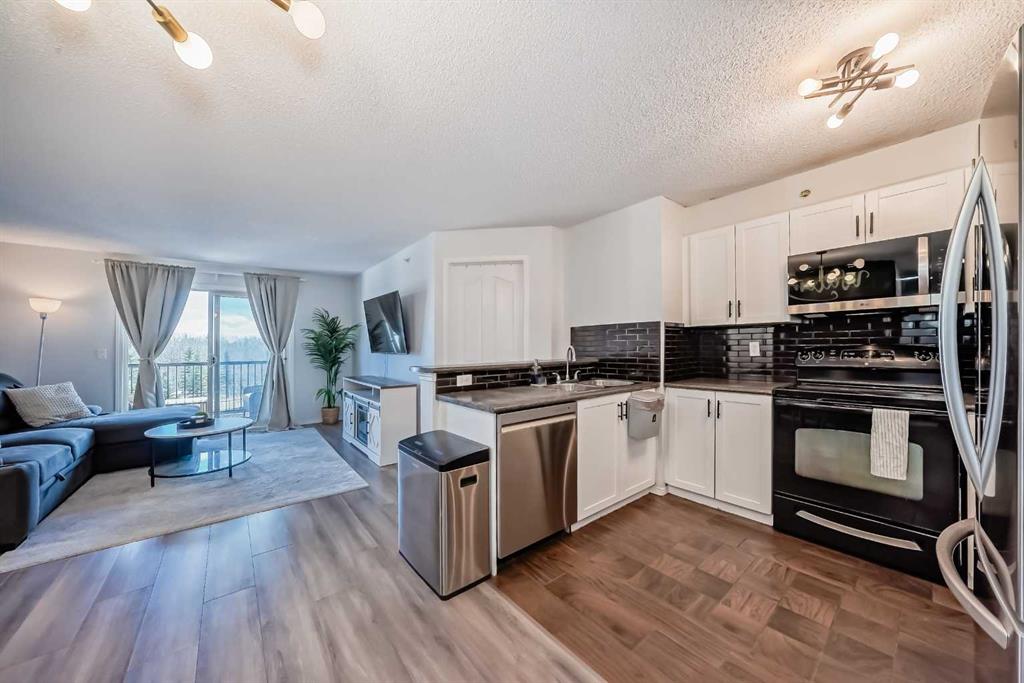 Don’t miss this rare TOP FLOOR opportunity! Perfectly positioned directly across from the ravine, this bright and beautifully updated 2 bedroom, 2 full bathroom + den unit offers stunning ravine views right from your private east facing balcony, the perfect spot to enjoy your morning coffee with peaceful surroundings. Step inside and you’re immediately welcomed by a fresh, modern aesthetic featuring a vibrant colour palette, and luxury vinyl plank flooring throughout. The open concept layout is designed to impress, offering not only a functional flow but also a spacious dining area ideal for entertaining or family meals. The stylish kitchen showcases a striking black backsplash that complements the white cabinetry, along with a breakfast bar, brand new stainless steel refrigerator, dishwasher, and microwave hood fan, plus upgraded lighting throughout the entire unit. The balcony also includes a gas line for your BBQ, making outdoor cooking effortless. The spacious primary bedroom features a walkin closet complete with custom organizers, while the second bedroom and versatile den provide flexible space for guests, a home office, or additional storage. Both four piece bathrooms are well appointed, and the in-suite laundry includes a brand new full size washer and dryer. Enjoy the convenience of an assigned parking stall located directly below your balcony, perfect for those cold Calgary mornings and remote starts. Even better, the affordable condo fee includes all utilities, adding incredible value and peace of mind. Ideally located with easy access to Stoney Trail, plus close proximity to public transit, shopping, and schools, this move-in-ready home is perfect for first-time buyers, young professionals, growing families, or savvy investors.