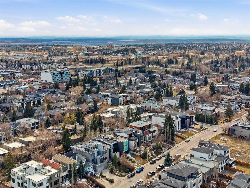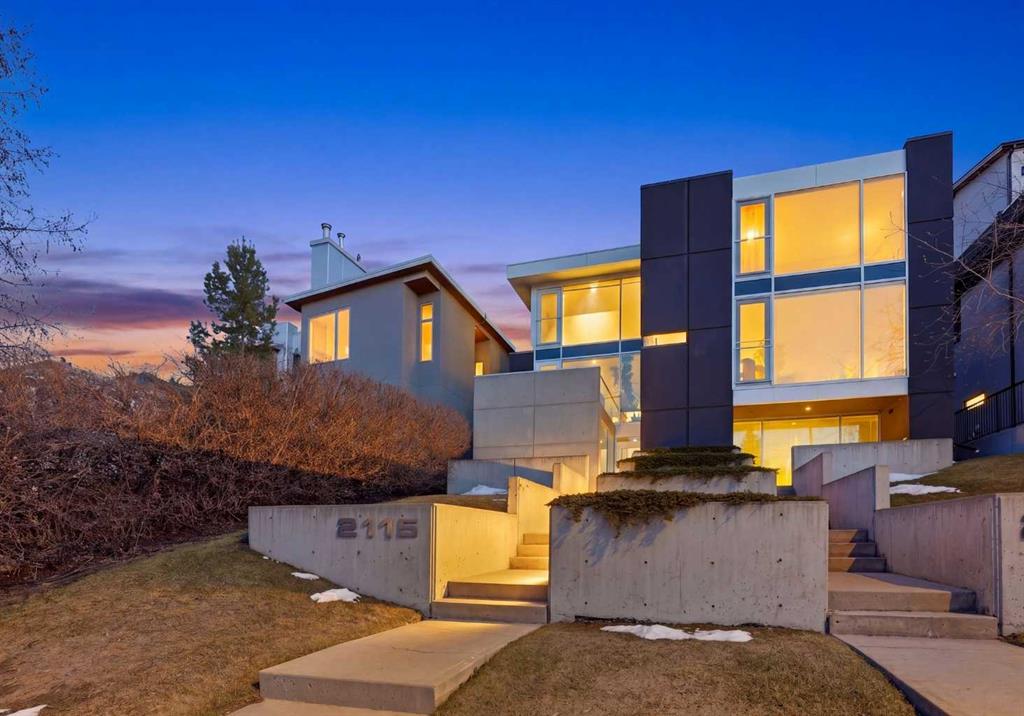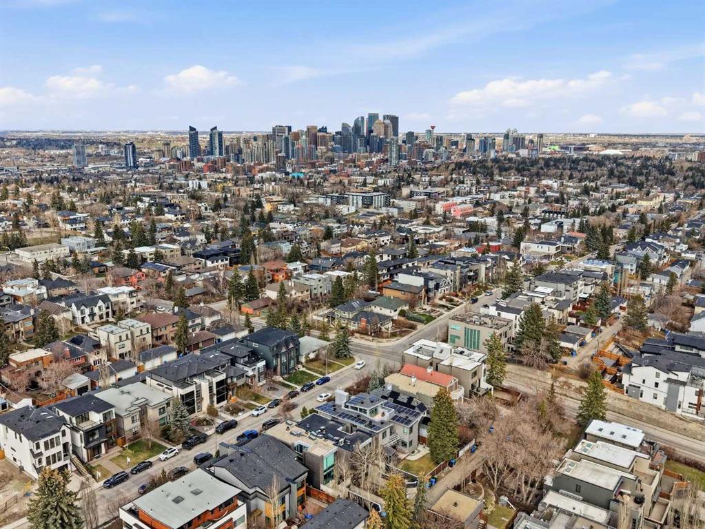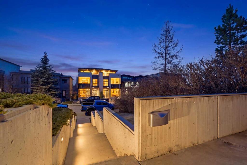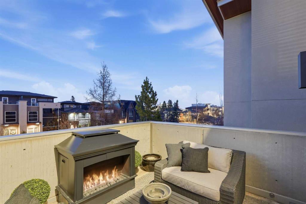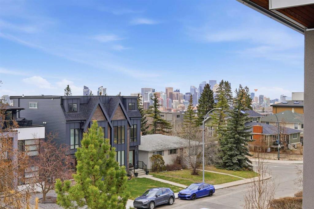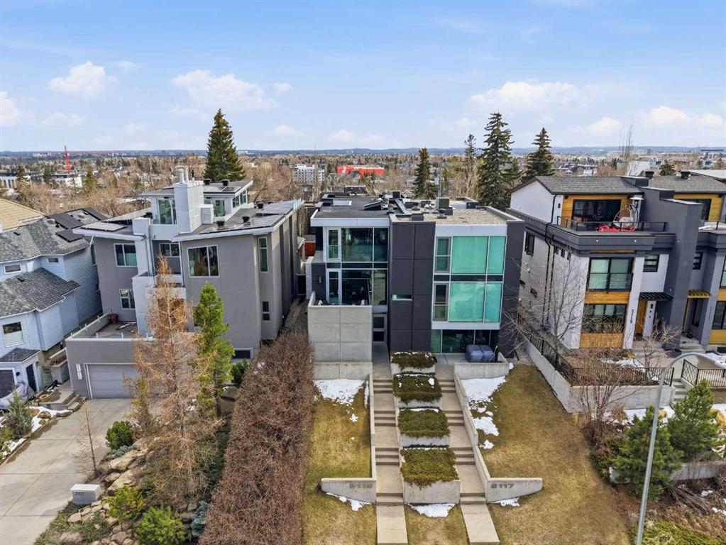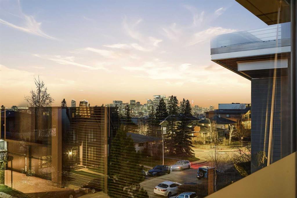 Impeccably positioned on a coveted street with unobstructed city and downtown views, this exceptional 2 bedroom residence with rare full concrete construction that is engineered for exceptional longevity, offers over 2,600 sq ft of luxurious living space. The main level is completely open from front to back, showcasing refinished tile flooring and custom millwork that frame a spacious living room with access to a private front terrace, all anchored by a striking gas fireplace. The sleek modern kitchen features granite countertops, a large island/eating bar, abundant storage including a walk in pantry, and stainless steel appliances. A dining room with built ins provides an elegant setting for hosting family and friends. A 2 piece powder room completes the main level. The top level, finished with new carpeting, is dedicated entirely to the primary retreat — a secluded oasis offering a massive bedroom with panoramic city, downtown, and mountain views, a dream walk in closet, and a tranquil sitting room. The ensuite is thoughtfully designed with two separate spaces: a serene area with a relaxing soaker tub, and a private 3 piece bath with an oversized shower. The lower level hosts a second bedroom with its own 3 piece ensuite, along with a dedicated laundry room with sink and storage. From here, enjoy direct access to the oversized single attached garage with a heated driveway. Additional highlights include central air conditioning, updated paint, new lighting and LED upgrades throughout, aluminum Hunter Douglas blinds, a new control panel and boiler pumps, and a new membrane roof. A north facing terrace offers the perfect vantage point for outdoor entertaining and warm summer evenings with stunning city and downtown views while a private south back patio is the perfect setting for relaxing afternoons soaking up the sun. This extraordinary home is ideally located near vibrant Marda Loop, excellent schools, shopping, public transit, and provides easy access to 26th Avenue, 14th Street, and Crowchild Trail.