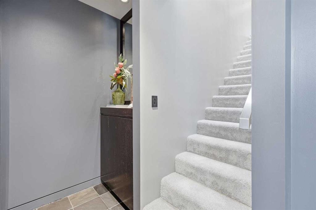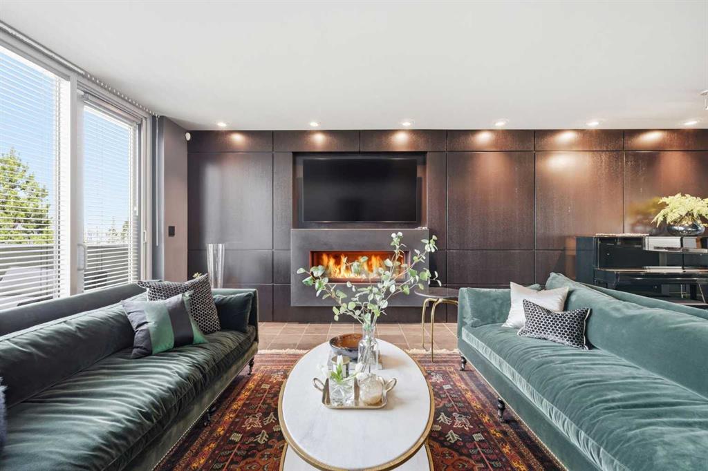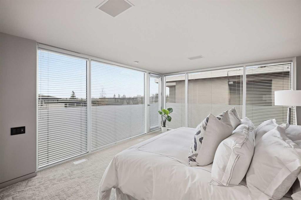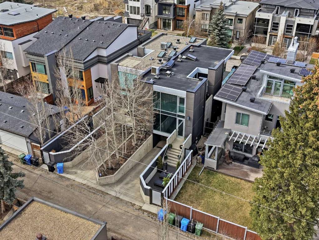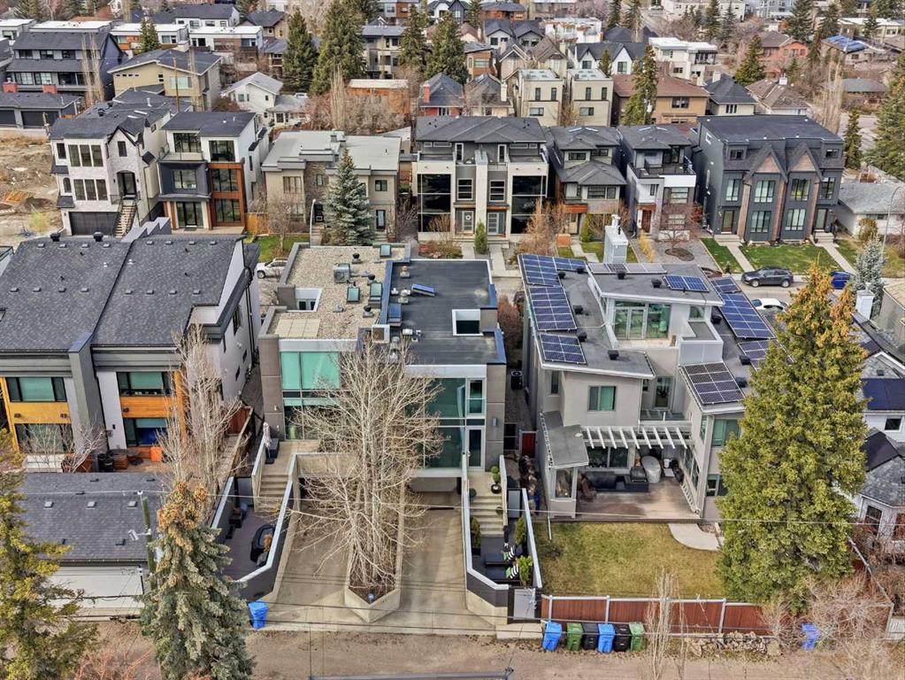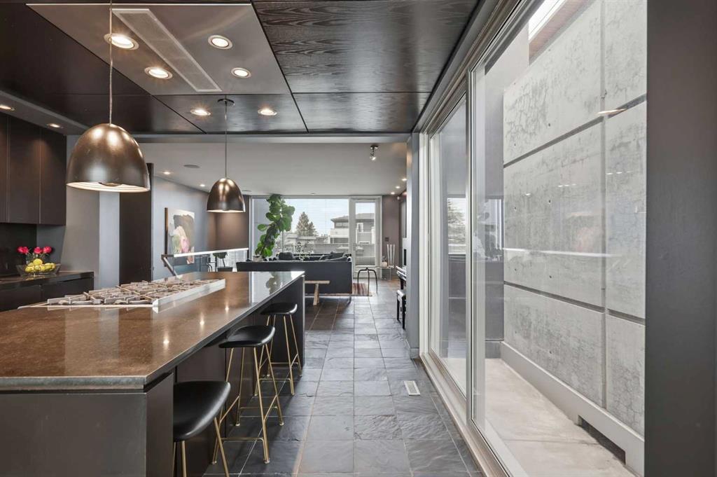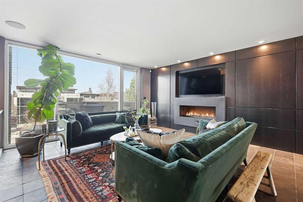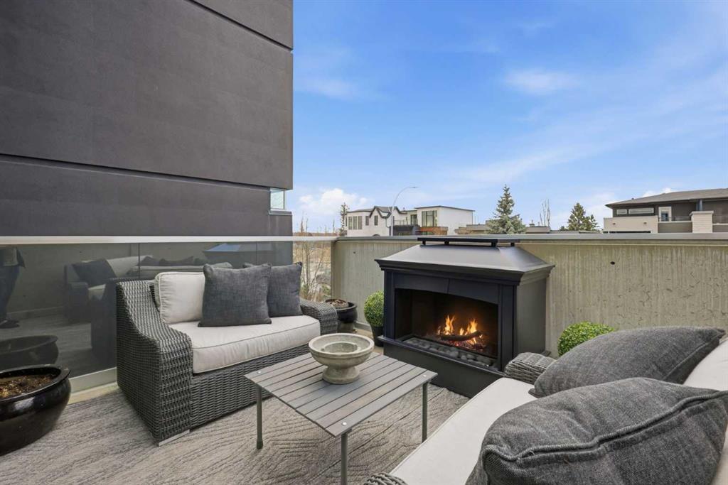 Impeccably positioned on a coveted street with unobstructed city and downtown views, this exceptional 2 bedroom residence with rare full concrete construction that is engineered for exceptional longevity, offers over 2,600 sq ft of luxurious living space. The main level is completely open from front to back, showcasing refinished tile flooring and custom millwork that frame a spacious living room with access to a private front terrace, all anchored by a striking gas fireplace. The sleek modern kitchen features granite countertops, a large island/eating bar, abundant storage including a walk in pantry, and stainless steel appliances. A dining room with built ins provides an elegant setting for hosting family and friends. A 2 piece powder room completes the main level. The top level, finished with new carpeting, is dedicated entirely to the primary retreat — a secluded oasis offering a massive bedroom with panoramic city, downtown, and mountain views, a dream walk in closet, and a tranquil sitting room. The ensuite is thoughtfully designed with two separate spaces: a serene area with a relaxing soaker tub, and a private 3 piece bath with an oversized shower. The lower level hosts a second bedroom with its own 3 piece ensuite, along with a dedicated laundry room with sink and storage. From here, enjoy direct access to the oversized single attached garage with a heated driveway. Additional highlights include central air conditioning, updated paint, new lighting and LED upgrades throughout, aluminum Hunter Douglas blinds, a new control panel and boiler pumps, and a new membrane roof. A north facing terrace offers the perfect vantage point for outdoor entertaining and warm summer evenings with stunning city and downtown views while a private south back patio is the perfect setting for relaxing afternoons soaking up the sun. This extraordinary home is ideally located near vibrant Marda Loop, excellent schools, shopping, public transit, and provides easy access to 26th Avenue, 14th Street, and Crowchild Trail.