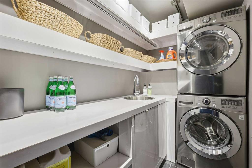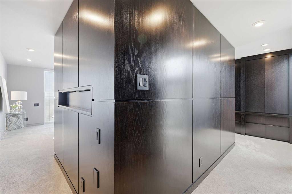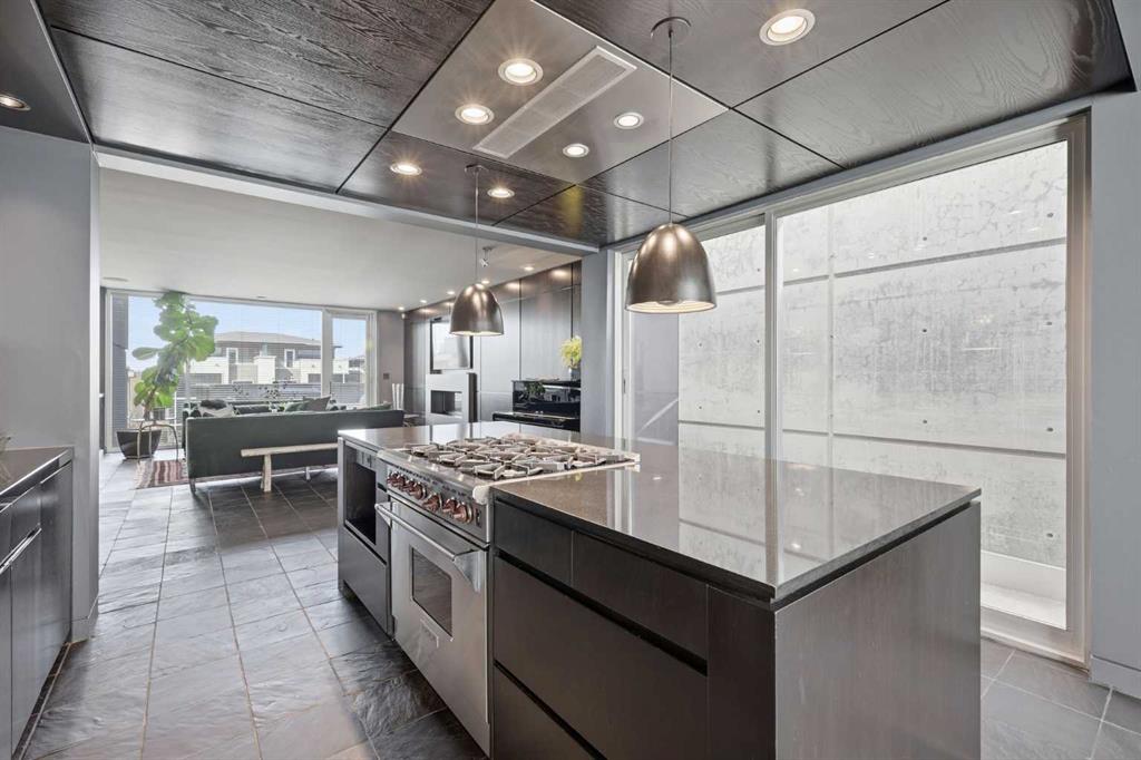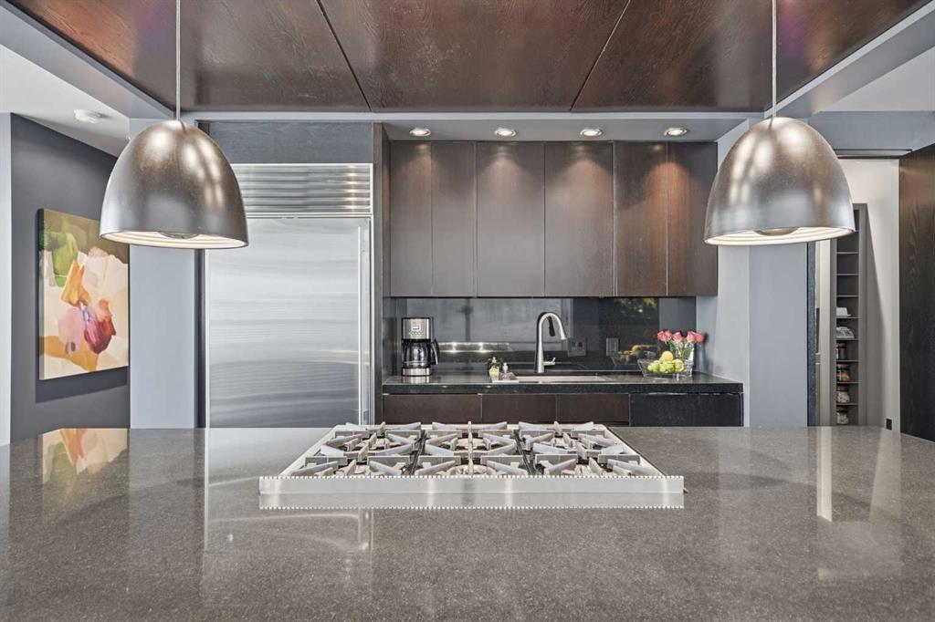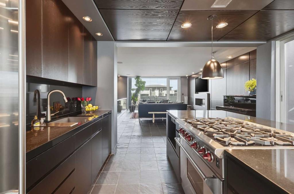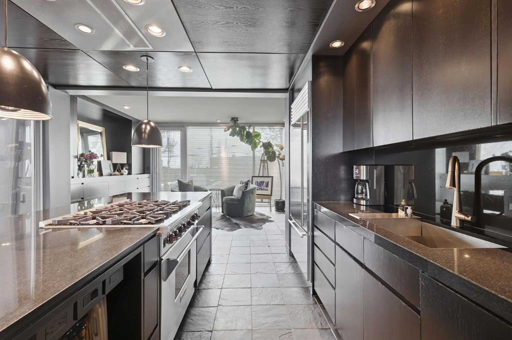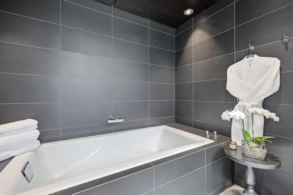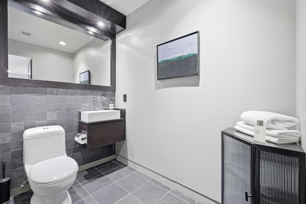 Impeccably positioned on a coveted street with unobstructed city and downtown views, this exceptional 2 bedroom residence with rare full concrete construction that is engineered for exceptional longevity, offers over 2,600 sq ft of luxurious living space. The main level is completely open from front to back, showcasing refinished tile flooring and custom millwork that frame a spacious living room with access to a private front terrace, all anchored by a striking gas fireplace. The sleek modern kitchen features granite countertops, a large island/eating bar, abundant storage including a walk in pantry, and stainless steel appliances. A dining room with built ins provides an elegant setting for hosting family and friends. A 2 piece powder room completes the main level. The top level, finished with new carpeting, is dedicated entirely to the primary retreat — a secluded oasis offering a massive bedroom with panoramic city, downtown, and mountain views, a dream walk in closet, and a tranquil sitting room. The ensuite is thoughtfully designed with two separate spaces: a serene area with a relaxing soaker tub, and a private 3 piece bath with an oversized shower. The lower level hosts a second bedroom with its own 3 piece ensuite, along with a dedicated laundry room with sink and storage. From here, enjoy direct access to the oversized single attached garage with a heated driveway. Additional highlights include central air conditioning, updated paint, new lighting and LED upgrades throughout, aluminum Hunter Douglas blinds, a new control panel and boiler pumps, and a new membrane roof. A north facing terrace offers the perfect vantage point for outdoor entertaining and warm summer evenings with stunning city and downtown views while a private south back patio is the perfect setting for relaxing afternoons soaking up the sun. This extraordinary home is ideally located near vibrant Marda Loop, excellent schools, shopping, public transit, and provides easy access to 26th Avenue, 14th Street, and Crowchild Trail.