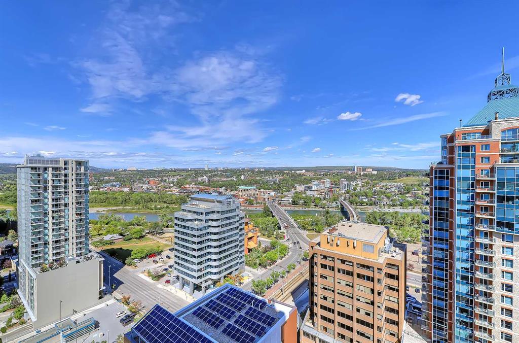 **Multiple Units & Floorplans Available - VISIT MULTIMEDIA LINK FOR FULL DETAILS!** This bright NORTH-facing 1-bed + den unit in upscale VOGUE w/ stunning PANORAMIC RIVER VIEWS from the 22nd floor and UNDERGROUND PARKING in upscale Vogue is a must-see! There are only 4 upgraded floors in the Vogue building which were specially customized for Bedouin Suites, and this is one of them! EXCLUSIVE BEDOUIN FEATURES include upgraded hallways and common areas, as well as INCREDIBLE UNIT UPGRADES like custom kitchen islands with bar seating, upgraded appliances & lighting including dimmers throughout, custom bedroom panelling including built-in side tables with convenience plugs, upgraded bathrooms with tile wainscoting and glass shower doors, built-in closets throughout, built-in walnut entertainment units, a Smart Sensor energy management system for the eco-minded buyer and MORE! This customized ‘VARSITY’ floorplan also had a kitchen wall removed for improved flow and natural light, and WOW, does it look good! This condo presents modern living at its finest, including an open-concept floor plan filled with natural light through ample floor-to-ceiling windows complimented by luxury vinyl plank flooring adorning the main living spaces. The modern kitchen boasts woodgrain cabinets w/ modern hardware & under cabinet lighting, a specially-designed central island with quartz counters, tile backsplash, dual basin undermount sink, & upgraded s/s appliances including a chimney-style hood fan. The open main living area features a built-in walnut entertainment unit with a wall-mount TV included & access to a large balcony w/ gas line for a BBQ & panoramic views of the Bow River. The bedroom features custom wall panelling w/ built-in side tables, wall sconce lighting and a convenient receptacle w/ a USB port, plus an included wall-mounted TV. A large walkthrough closet w/ built-in organizers and stacked laundry leads to the 4-pc bathroom complete with occupancy-sensored lights, quartz countertops, tile wainscoting, an undermount sink with modern faucet, tile backsplash, modern vanity with storage, tile floors, and a large tub/shower combo with full height tile and an upgraded glass door. Complete w/ a sizeable den, a perfect home office or flex space, a titled indoor parking stall in the heated parkade and a storage locker. VOGUE is a high-end building w/ a ton of amenities, including central A/C, an elegant formal lobby, full-time concierge, gym, billiards, large party room w/ kitchen, yoga studio, 36th floor Sky Lounge, & multiple rooftop terraces. Surrounded by parks, transit, the LRT, shopping & more, & within walking distance to the downtown core & all Kensington shops & services – this location offers the best urban lifestyle in the Downtown Commercial Core.