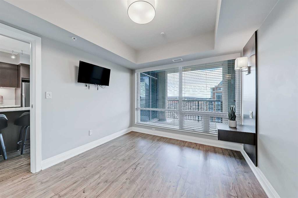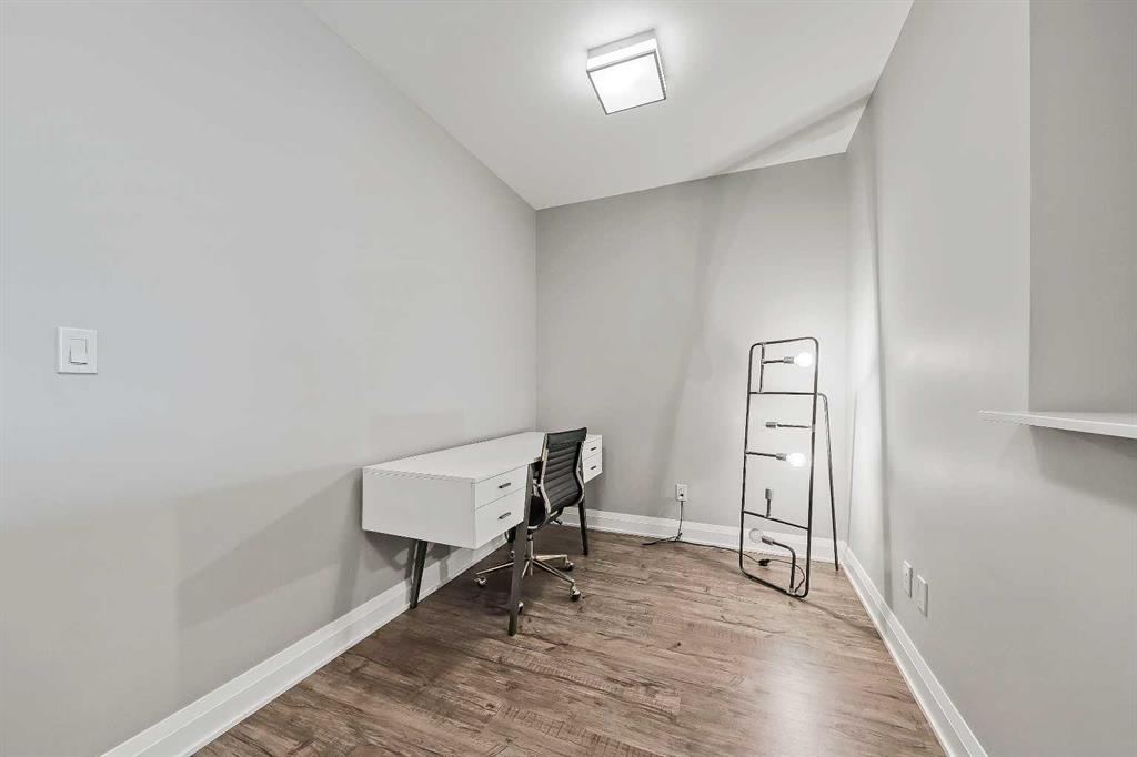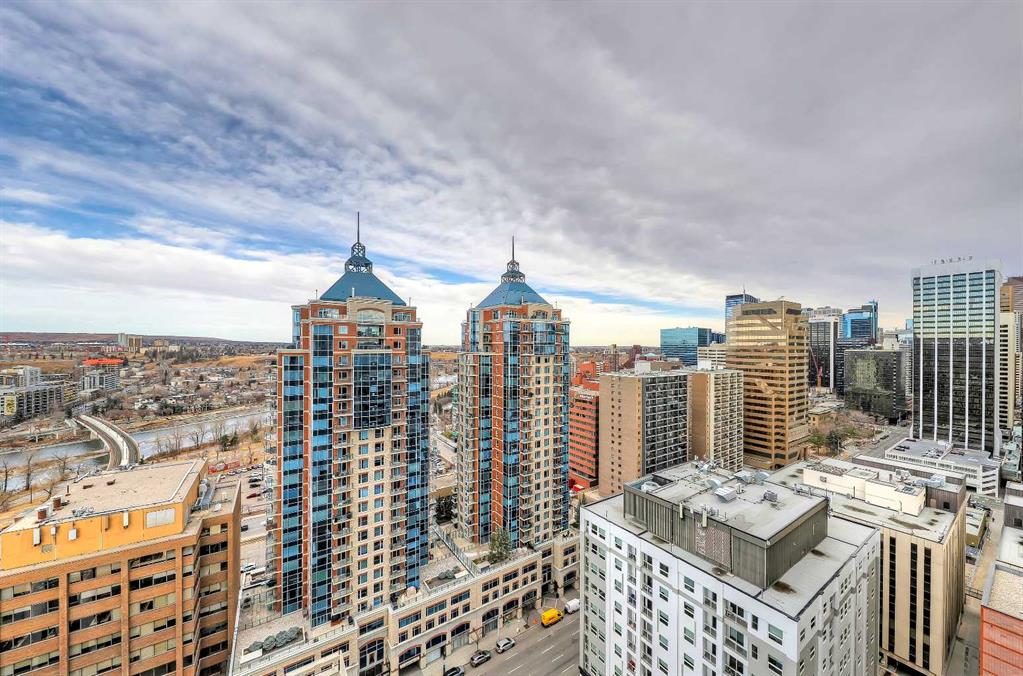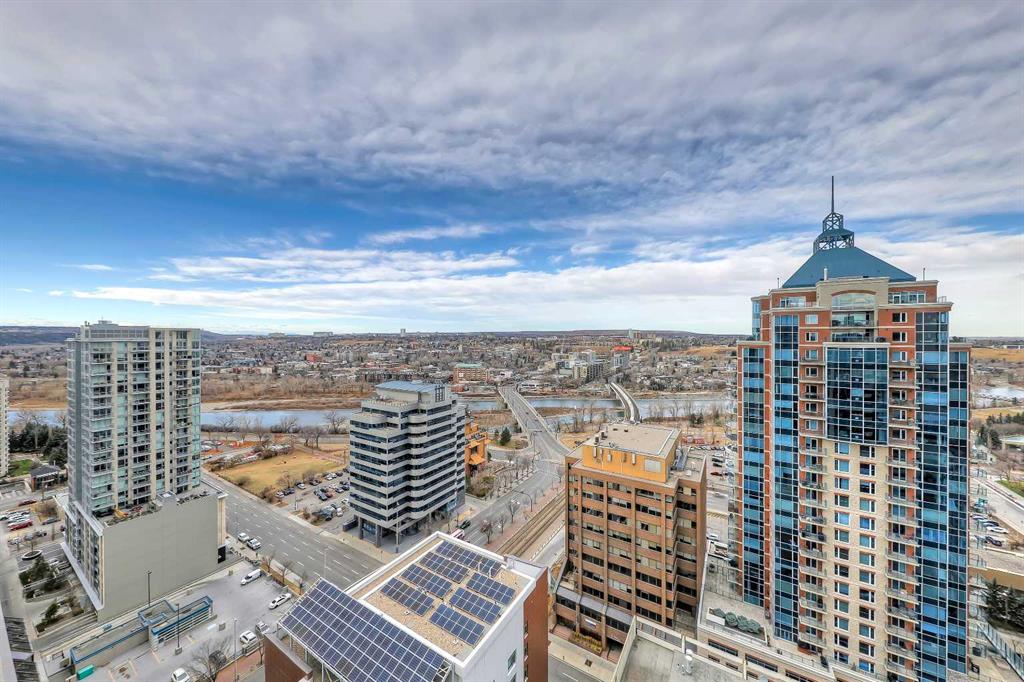 *VISIT MULTIMEDIA LINK FOR FULL DETAILS, INCLUDING IMMERSIVE 3D TOUR & FLOORPLANS!* This bright NORTH-facing 1-bed + den unit with stunning PANORAMIC RIVER VIEWS from the 23rd floor in the upscale Vogue building is a must-see! There are only 4 upgraded floors in the Vogue building, which were specially customized for Bedouin Suites, and this is one of them! EXCLUSIVE BEDOUIN FEATURES include upgraded hallways and common areas, as well as INCREDIBLE UNIT UPGRADES like custom kitchen islands with bar seating, upgraded appliances & lighting including dimmers throughout, custom bedroom panelling including built-in side tables with convenience plugs, upgraded bathrooms with tile wainscoting and glass shower doors, built-in walnut entertainment units, a Smart Sensor energy management system for the eco-minded buyer and MORE! This customized ‘VARSITY’ floorplan also had a kitchen wall removed for improved flow and natural light, and WOW, does it look good! This condo presents modern living at its finest, including an open-concept layout filled with natural light through ample floor-to-ceiling windows, complemented by luxury vinyl plank flooring adorning the main living spaces. The modern kitchen boasts wood-grain cabinets with modern hardware and under-cabinet lighting, a specially designed central island with quartz counters, a tile backsplash, a dual-basin undermount sink, and upgraded stainless steel appliances, including a chimney-style hood fan. The open main living area features a built-in walnut entertainment unit with a wall-mount TV included and access to a large balcony with a gas line for a BBQ and panoramic views of the Bow River. The bedroom features custom wall panelling with built-in side tables, wall sconce lighting and a convenient receptacle with a USB port, plus an included wall-mounted TV. A large walkthrough closet with built-in organizers and a stacked laundry leads to the 4-pc bathroom complete with occupancy-sensored lights, quartz countertops, tile wainscoting, an undermount sink with modern faucet, tile backsplash, modern vanity with storage, tile floors, and a large tub/shower combo with full height tile and an upgraded glass door. Complete with a sizeable den, a perfect home office or flex space, a titled indoor parking stall in the heated parkade and a storage locker. VOGUE is a high-end building with a ton of amenities, including central A/C, an elegant formal lobby, full-time concierge, gym, billiards, a large party room with a kitchen, a yoga studio, a Sky Lounge on the 36th floor, and multiple rooftop terraces. Surrounded by parks, transit, the LRT, shopping & more, & within walking distance to the downtown core & all Kensington shops & services – this location offers the best urban lifestyle in the Downtown Commercial Core. *Please note, the photos are from the same unit, one floor up.