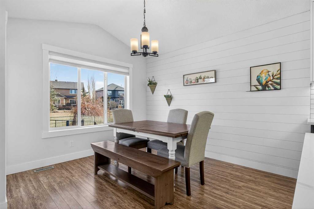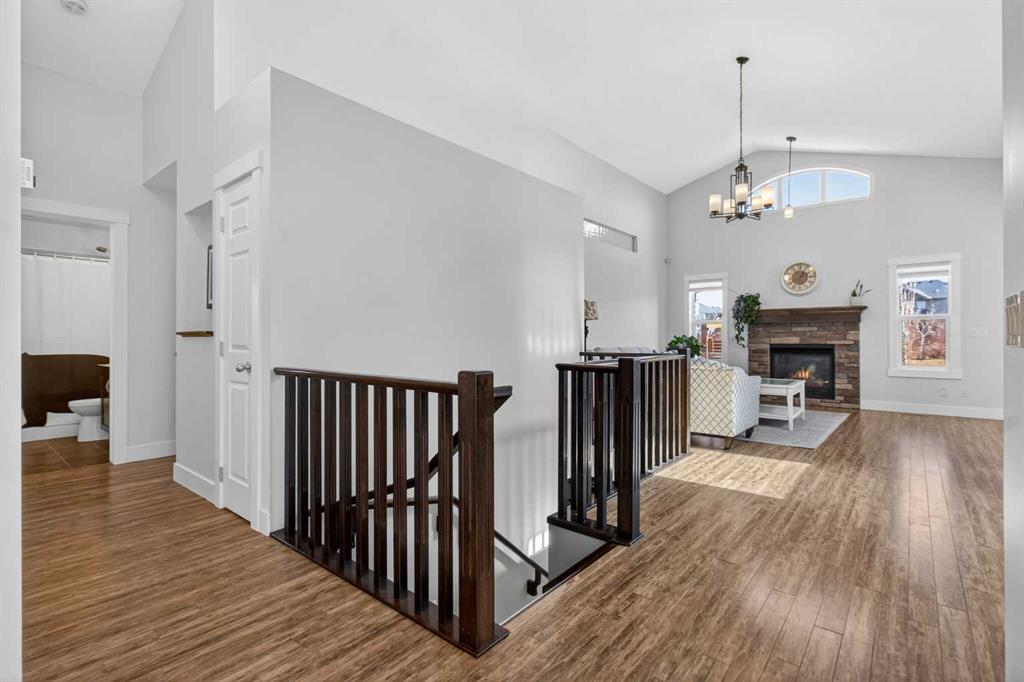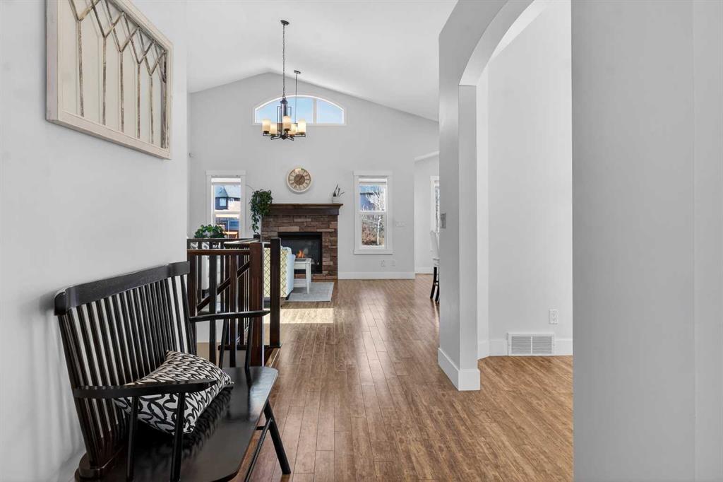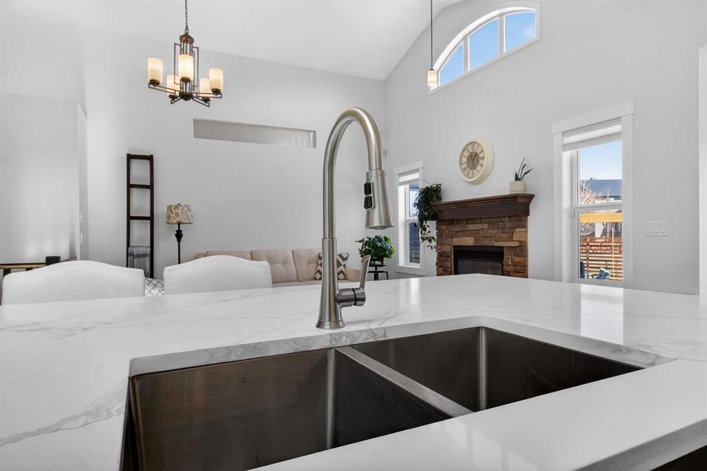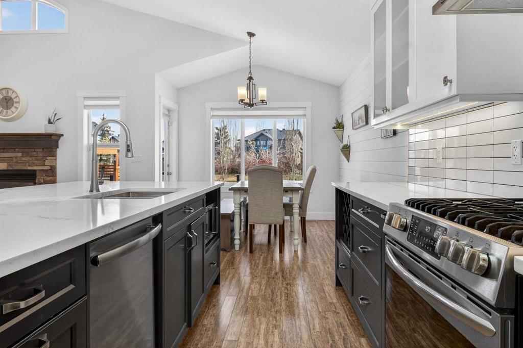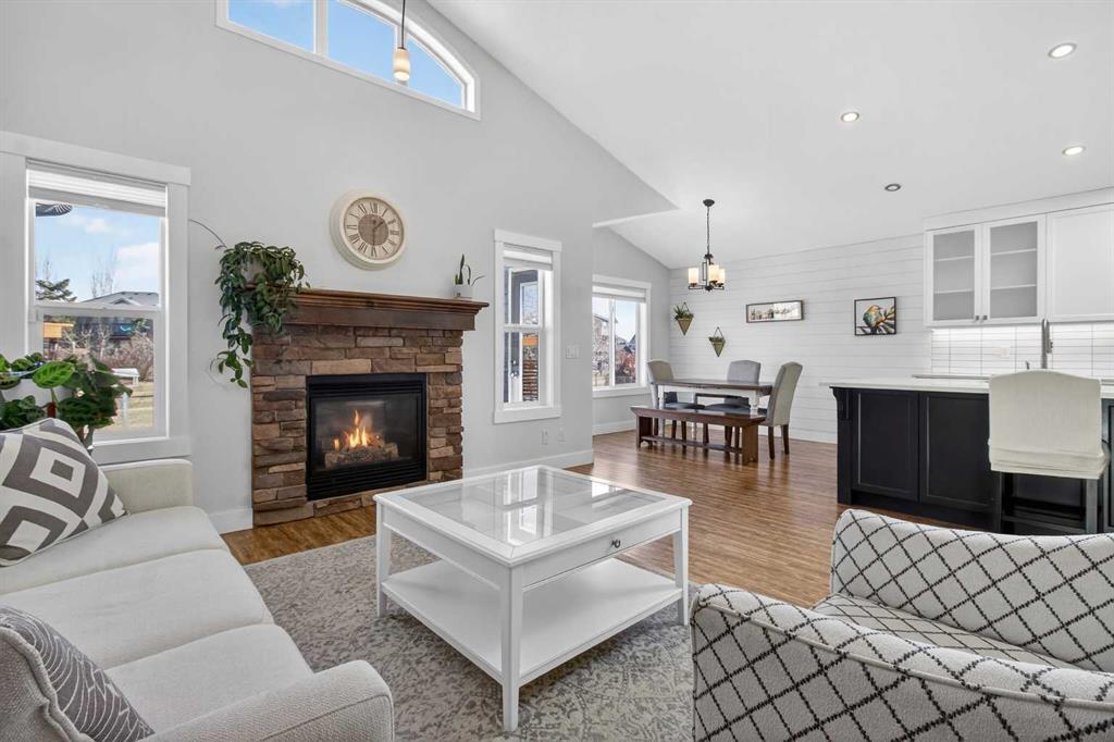 BOULDER CREEK ESTATES | VAULTED CEILINGS | CENTRAL AIR CONDITIONING | Immaculate, fully finished 4 bedroom, 3 bath, 1800 sq ft bungalow offers over 3,000 sq ft of beautifully designed living space! The charming curb appeal draws you in with a welcoming front porch and an impressive triple car garage, setting the tone for the exceptional home that awaits. Boasting a bright and airy open floorplan with soaring cathedral ceilings and abundant windows, this home features a formal dining room, a spacious den, and a welcoming living room with a gas fireplace for cozy nights in. The chef-inspired kitchen features granite countertops, stainless steel appliances, a gas stove, skylight, and ample cabinetry. The spacious primary suite includes a stylish barn door and a luxurious 5 pc ensuite. The fully developed lower level adds a large recreation room with a second gas fireplace, two additional bedrooms, generous storage, and the convenience of two laundry rooms. Situated on a private reverse pie lot backing onto green space, the landscaped backyard with underground sprinklers creates a peaceful outdoor retreat. Boulder Creek Estates is a vibrant community with nearby amenities including Boulder Creek Golf Course, the Langdon Fieldhouse, skatepark, playgrounds, schools, and local shops and restaurants, scenic walking paths, and convenient access to major commuting routes. Thoughtfully upgraded and meticulously maintained, this exceptional home offers space, comfort, and elegance just minutes from Calgary.