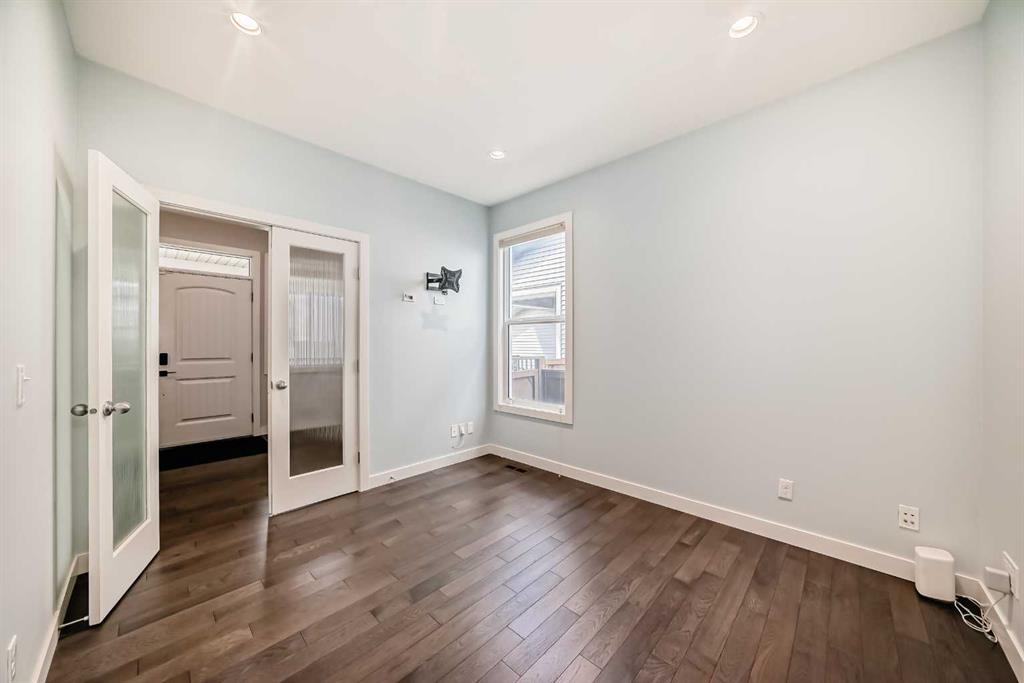 Inside, a bright and inviting foyer leads to a versatile flex room behind elegant French doors—perfect for a home office or quiet retreat. The open concept main floor is ideal for entertaining, showcasing a stylish kitchen with granite countertops, upgraded appliances, and a convenient walk through pantry. The spacious great room, centered around a cozy gas fireplace, flows effortlessly into the dining area. A main floor laundry room adds everyday functionality.